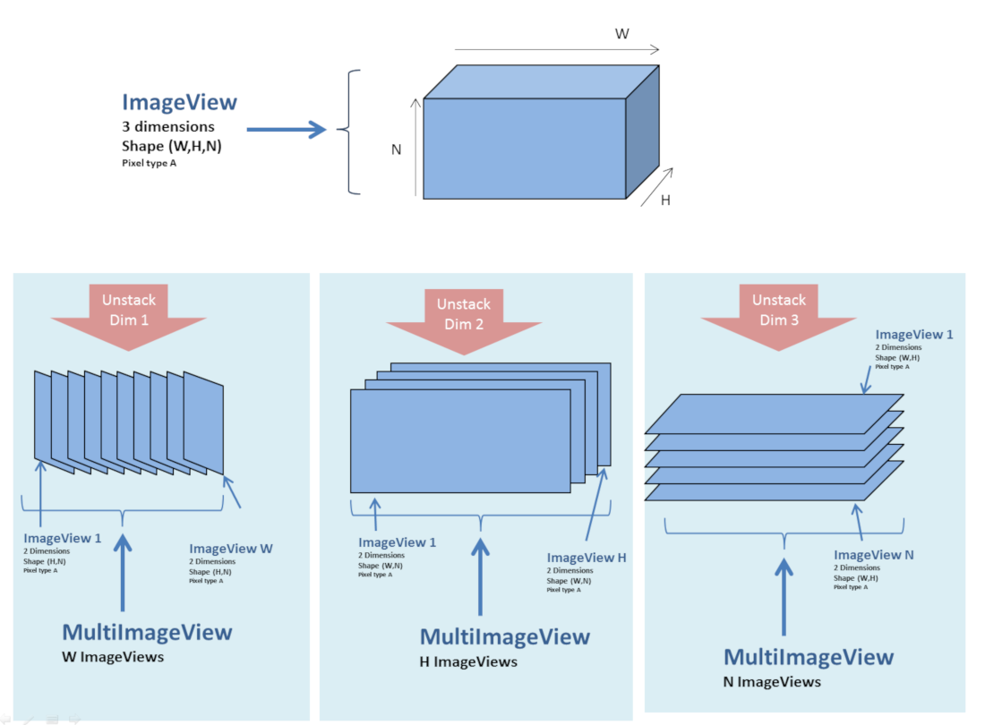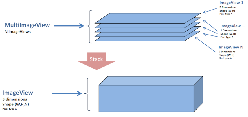 A view can point toward multiple ImageViews. This is a simple way to handle a stack of images. MultiImageView object aggregates ImageViews with heterogenous properties (Pixel Type, dimensions, shape)