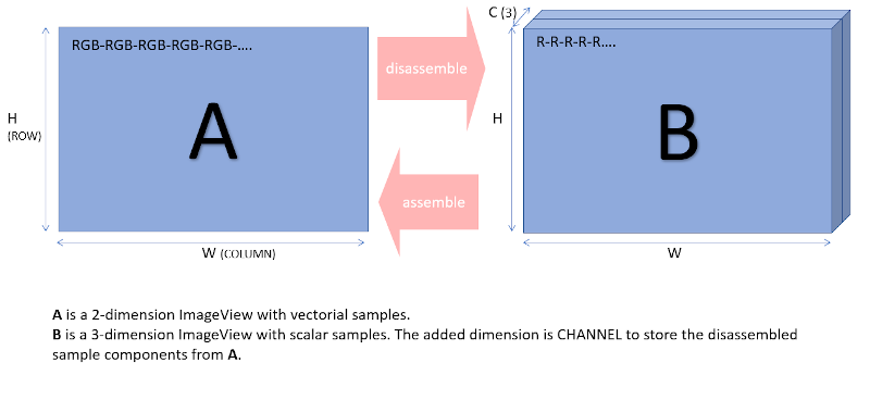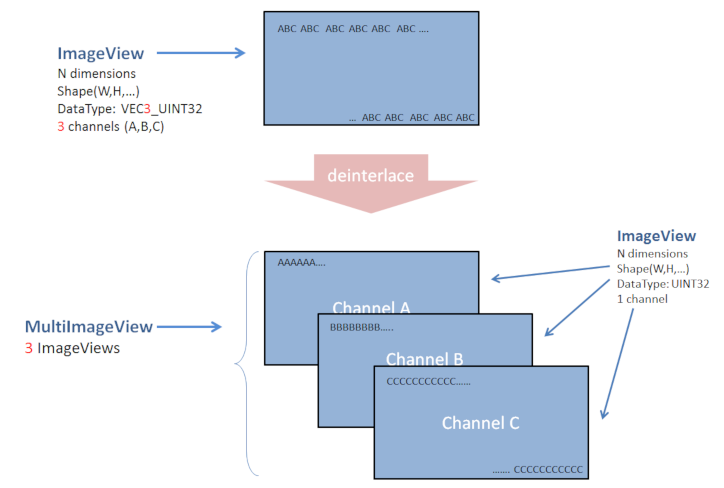 It is possible to deinterlace a N-dimensional ImageView with a vectorial-typed sample, to create a N+1 dimensional ImageView. A new CHANNEL dimension is created.