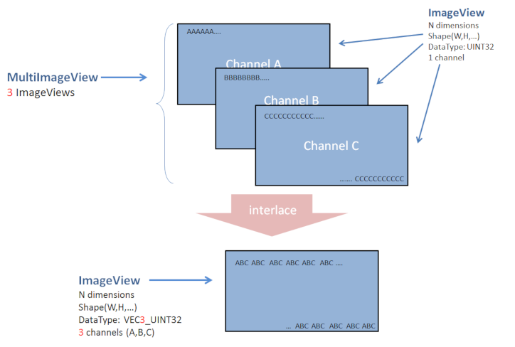 It is also possible to do the opposite. Starting from a MultiImageView containing many frames of teh same shape and datatype, one for each channel, and interlacing these frames to create an ImageView.