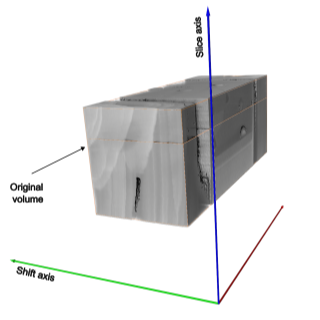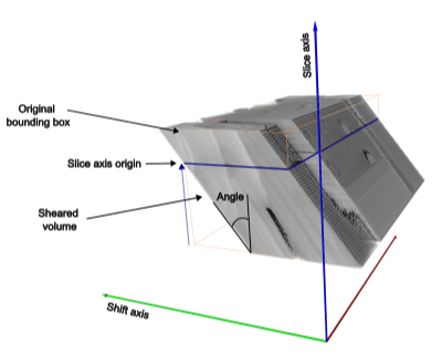 This algorithm applies a shear transformation which can be seen as the translation of axis-aligned slices along a user-defined direction. It shears the input volume using 2 axes. The first axis (slice axis) is the axis of influence; it, together with the shear angle, determines the shift value. The second axis (shift axis) defines the direction along which the slices are translated.