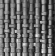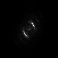 Usually, periodicities stand out in the FFT. We already saw the case of parallel lines. More complex cases remain very close to that ideal situation.For instance, considering the Fourier transform of an image of vertical parallel camshafts in Figure 6, the horizontal periodicity of the camshafts generates two peaks on the horizontal axis. The two symmetric peaks correspond to parallel and interrupted horizontal lines of the cams and spaced by an average distance of 21 pixels. For a 256x256 image, peaks are then at frequencies of $ \pm 256/21 = \pm 12$.