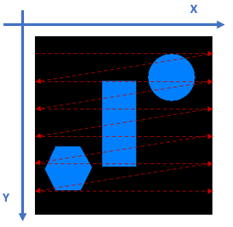 The connected-component labeling algorithm scans the input image from its first to its last row along the y-axis, and from its first to its last column along the x-axis. With a standard visualization of a 2D image considering the image origin in the top left corner and the y-axis down, this algorithm scans the input image from top to bottom and left to right.